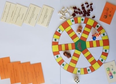 Les élèves s’installent autour des plateaux : 4 élèves par plateau, 2 équipes de 2 élèves. Au début du jeu, chaque équipe dispose son pion au centre du plateau. L’objectif est d’obtenir 10 points avec l’obligation d’obtenir au moins 5 points en histoire et 5 points en géographie. Une équipe lance le dé et avance selon le chiffre indiqué. Le pion s’arrête sur une case de couleur. L’autre équipe pose une question de la couleur indiquée. Si la première équipe répond convenablement, elle gagne un haricot blanc ou rouge. Si cette même équipe ne répond pas correctement, elle passe le dé à l’autre équipe. Dès qu’une équipe a obtenu les 10 points-haricots, elle se place au centre du plateau. L’équipe adverse pose à chaque membre une question qui leur a déjà été posée. À ce stade du jeu, il ne peut pas y avoir entraide dans l’équipe. Si tous les membres de l’équipe ont répondu, elle est gagnante.