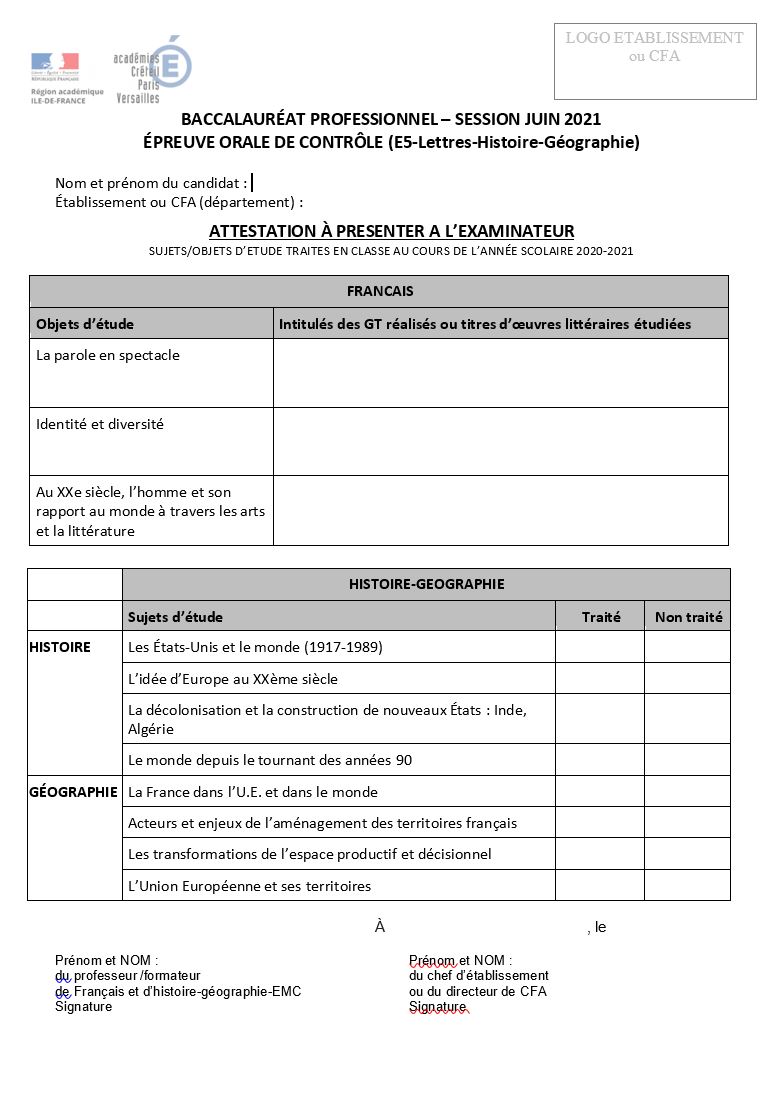 Attestation pour l’oral de contrôle du Bac Pro