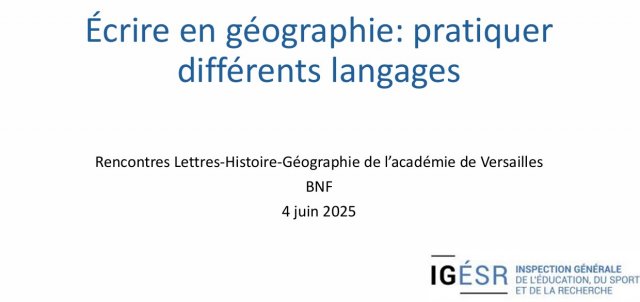 Françoise Janier-Dubry et Florence Smits, inspectrices générales d’histoire-géographie, ont conjointement conçu un diaporama intitulé « Écrire en géographie : pratiquer différents langages », qui a servi de support à l’intervention de Florence Smits lors des rencontres de lettres-histoire des 3 et 4 juin 2025.