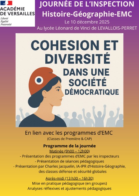 Le mercredi 10 décembre 2025, de 9h00 à 16h30, se tiendra au lycée polyvalent Léonard de Vinci de Levallois-Perret une journée de formation consacrée aux nouveaux programmes d’EMC de CAP et de première baccalauréat professionnel.